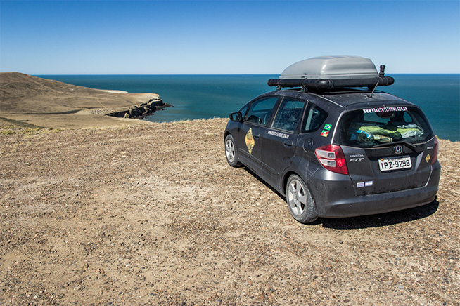 O Honda Fit usado na viagem do projeto Road Sweet Home, durante parada em Puerto San Julian, na Argentina LUIS FERNANDO KOLINGER