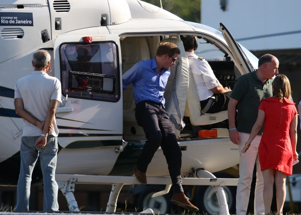 Príncipe britânico Harry desce de helicóptero, no Heliporto da Lagoa, na zona sul do Rio de Janeiro, após sobrevoar a cidade.