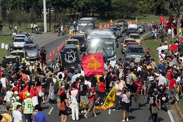 Protestantes tentam bloquear a rua e polícia tenta dispersá-los