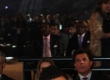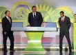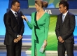 Da esquerda para direita, o apresentador Tadeu Schmidt observa o governador do Rio de Janeiro, Sérgio Cabral, cumprimentar o prefeito da capital fluminense, Eduardo Paz. À esquerda, a apresentadora Fernanda Lima.