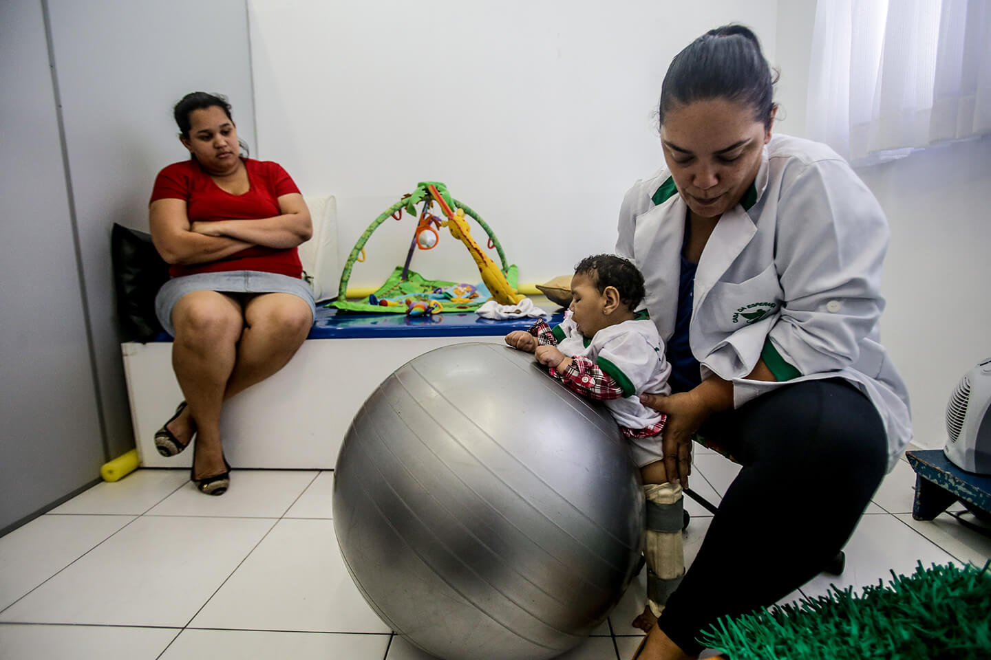 Sem a mãe para ajudar, Jaqueline passou a pagar uma vizinha para cuidar de Lucas duas vezes por semana, nos dias do tratamento de Laura. Eram R$ 200 a menos no orçamento já estreito. Cuidar dos dois bebês sozinha era difícil até mesmo quando a dona de casa não saía. Aos seis meses, o menino ainda mamava e já estava ativo, querendo se arrastar e mexer nos objetos. Laura, no seu tempo, precisava de cuidados constantes, agravados pelos quadros de espasmos e irritabilidade constante, característicos da microcefalia. “Ela chorava o dia inteiro. Dava muita dó porque ela ficava até cansada, ia para as terapias e não conseguia nem participar dos exercícios”, conta a mãe.