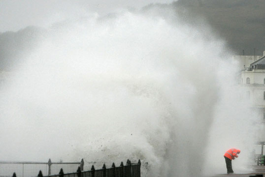 Homem se protege de onda do mar em ressaca na Inglaterra (2007)2