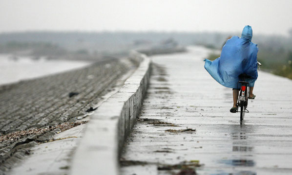 Na foto, Mulher anda de bicicleta debaixo de chuva no Vietnã