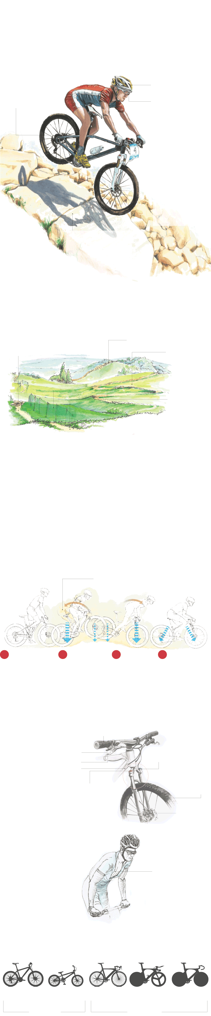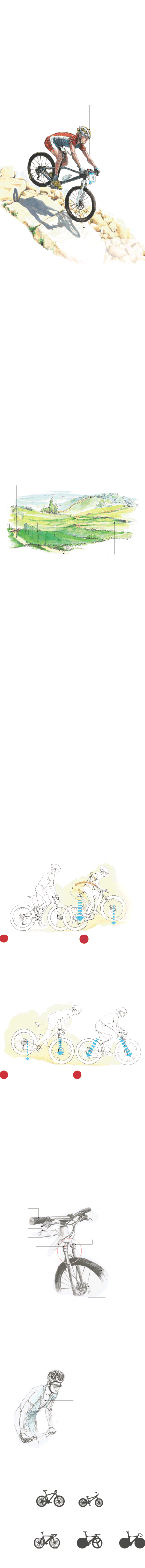 Nas descidas, o ciclistas adota a posição indicada na ilustração maior acima, com o tronco projetado para trás, diminuindo o impacto na roda dianteira
