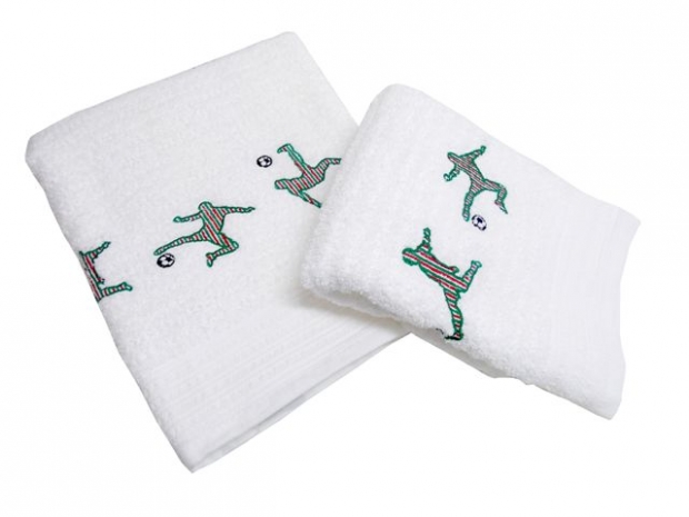 Toalhas de banho Alfaias (www.alfaias.com.br) com estampa de jogadores de futebol, R$ 59,90 (banho) e R$ 29,90 (rosto)
