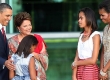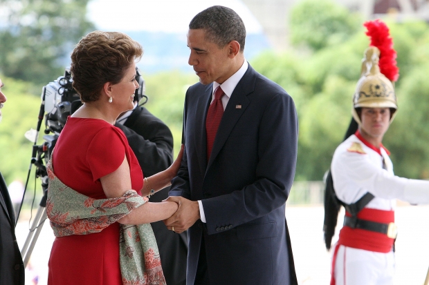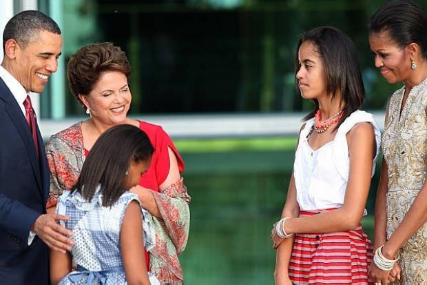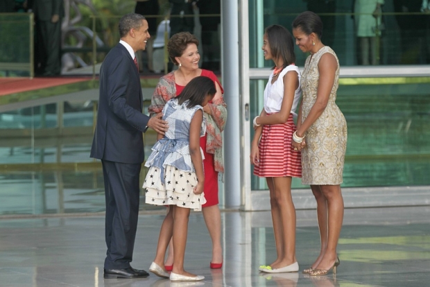 Dilma Rousseff com Barack e Michele Obama e as filhas no Palácio da Alvorada, em Brasília.