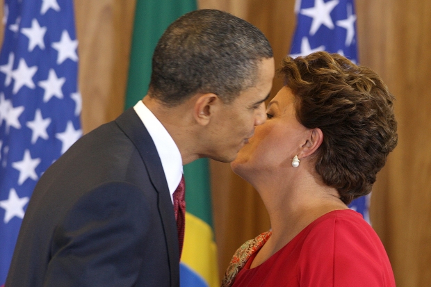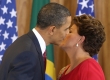 O presidente Barack Obama beija a presidente Dilma Roussseff após declaração à imprensa, no Palácio do Planalto, neste sábado, 19