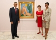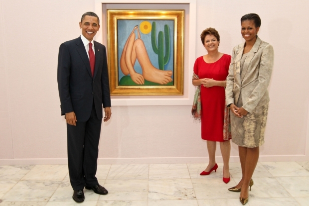 Presidente Barack Obama, presidente Dilma e a primeira-dama Michelle Obama ao lado do quadro Abaporu, da artista Tarsila do Amaral