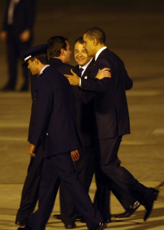 Eduardo Paes, prefeito do RJ e S�rgio Cabral, governador do Rio de Janeiro recepcionam Barack Obama e sua fam�lia na base a�rea no Gale�o. FOTO: JF DIORIO/AE