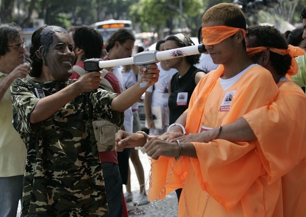 Manifestantes fazem protesto diante do Theatro Municipal do Rio, onde o presidente Barack Obama discursou, nesse domingo, 20