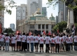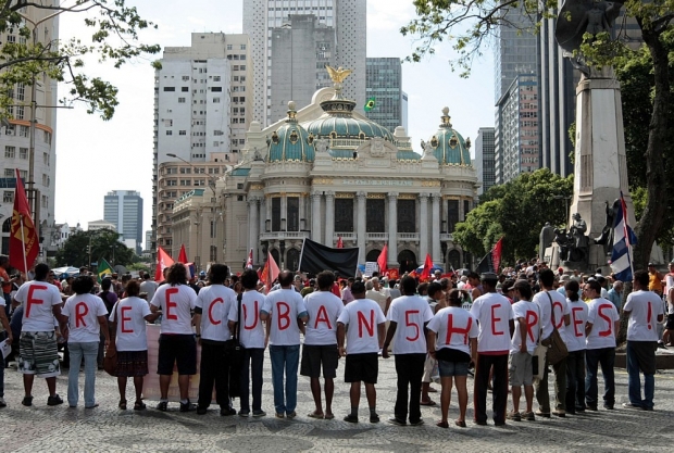 Manifestantes contrários à visita de Obama ao Brasil fazem protesto nas proximidades do Theatro Municipal, nesse domingo, 20