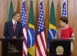 Presidente Barack Obama e a presidente Dilma Roussseff durante discursos no Palácio do Planalto, neste sábado, 19