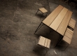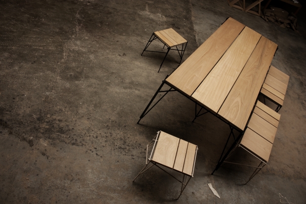 Mesa e banco Vergalho, de vergalhão de aço e madeira