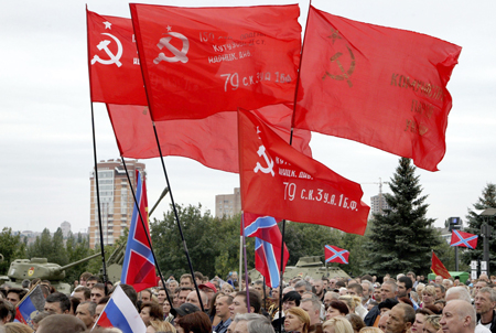 Bandeiras russas e da Nova Rússia, formada pelas autoproclamadas repúblicas populares de Donetsk e Luhansk |