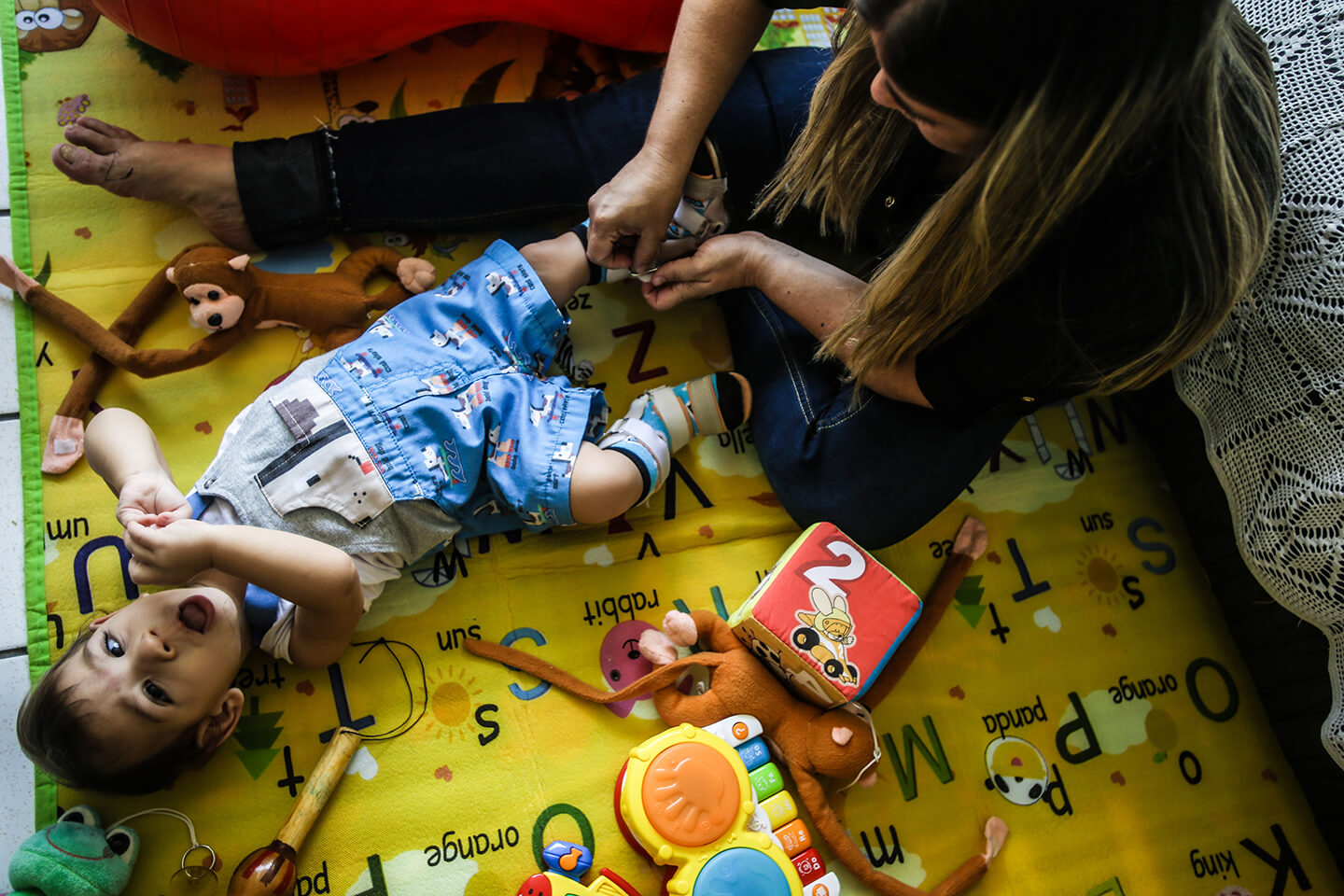 Não são nem 8 horas e Matheus já está acordado, vestindo seu macacão de estampa de cachorros, meias coloridas, botinha ortopédica e óculos de armação azul. Mãe e avó terminam de arrumar o menino para a natação. É terça-feira e a agenda do dia está cheia. Depois da aula na piscina, Matheus vai voltar para casa para almoçar, de lá segue às 15h50 para a sessão de terapia ocupacional (TO) e, em seguida, às 18 horas, tem hidroterapia.