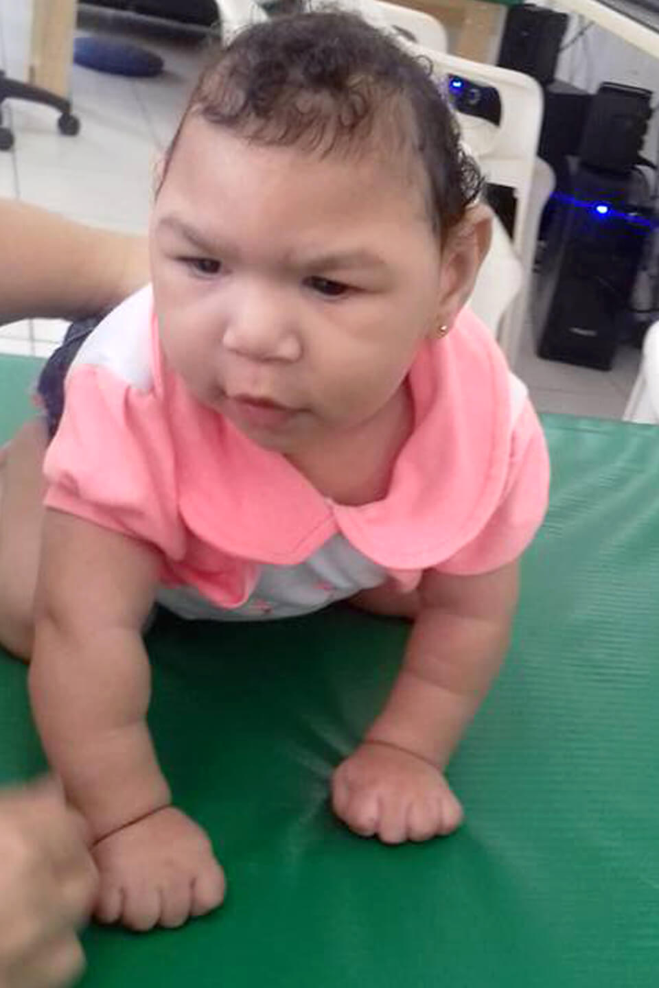 Já no atendimento com a fisioterapeuta, o objetivo inicial era ganhar o controle cervical. Em um dos exercícios realizados, Laura era colocada na posição de gatinho e a profissional passava a tentar chamar a atenção dela com brinquedos e ruídos. O objetivo era que, com o estímulo, ela conseguisse levantar a cabeça para olhar para frente. Aos cinco meses, a bebê mantinha essa posição por apenas poucos segundos.
