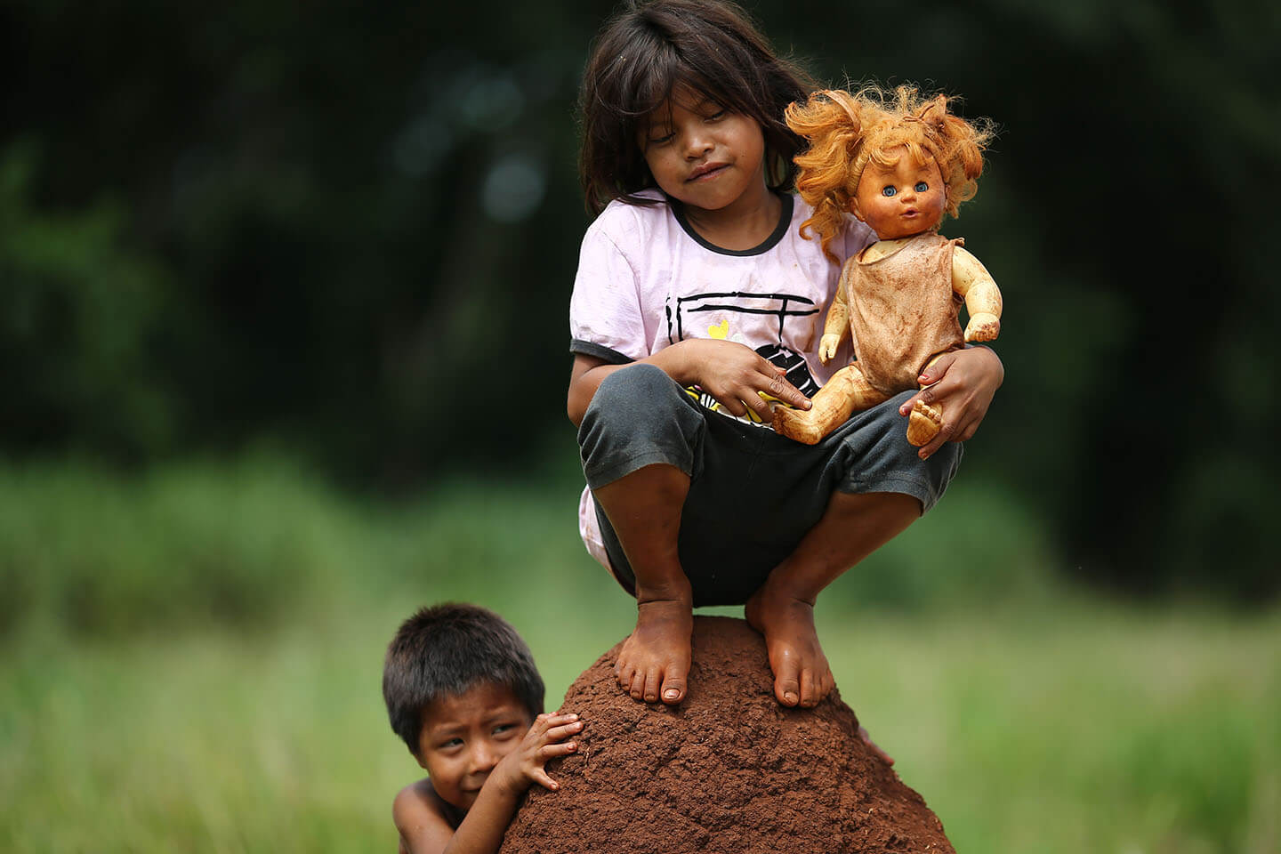 Os pequenos guarani-caiová deitam na terra para beber a água que desce pelo córrego do acampamento indígena Apyka’i, a sete quilômetros do centro de Dourados, no Mato Grosso do Sul. Sandrieli, de seis anos de idade, e Jackson, de quatros anos, esticam o pescoço e mergulham o rosto no fio de água suja que corre ao lado da rodovia BR-463. Crises de vômito, diarreia e febre passaram a ser rotina na vida das crianças. Feridas aparecem pelo corpo.